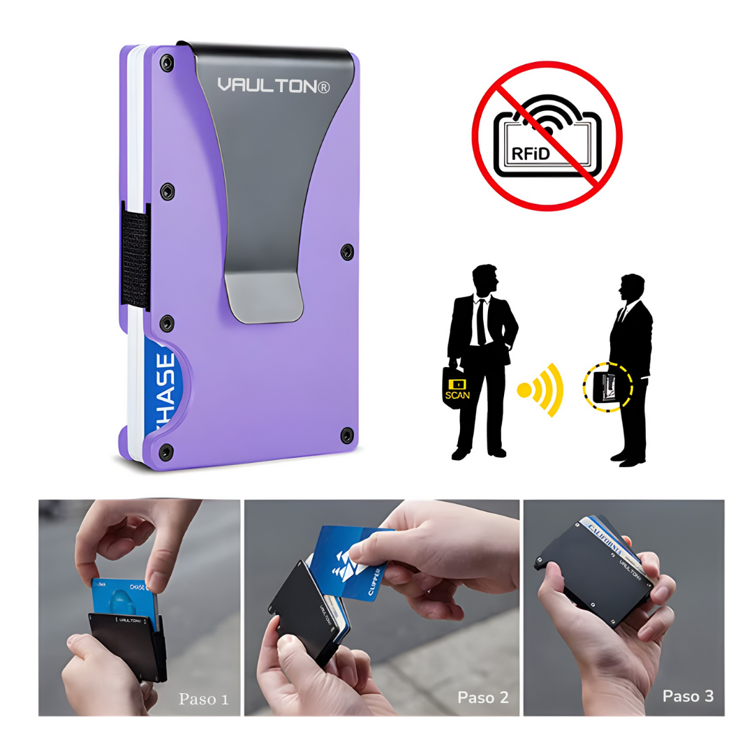El cuerpo metálico de VAULTON bloquea lectores RFID para proteger tus tarjetas del robo de datos.